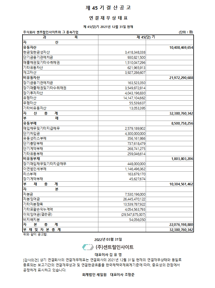 Á¦45±â °á»ê°ø°í_¿¬°áÀ繫»óÅÂÇ¥